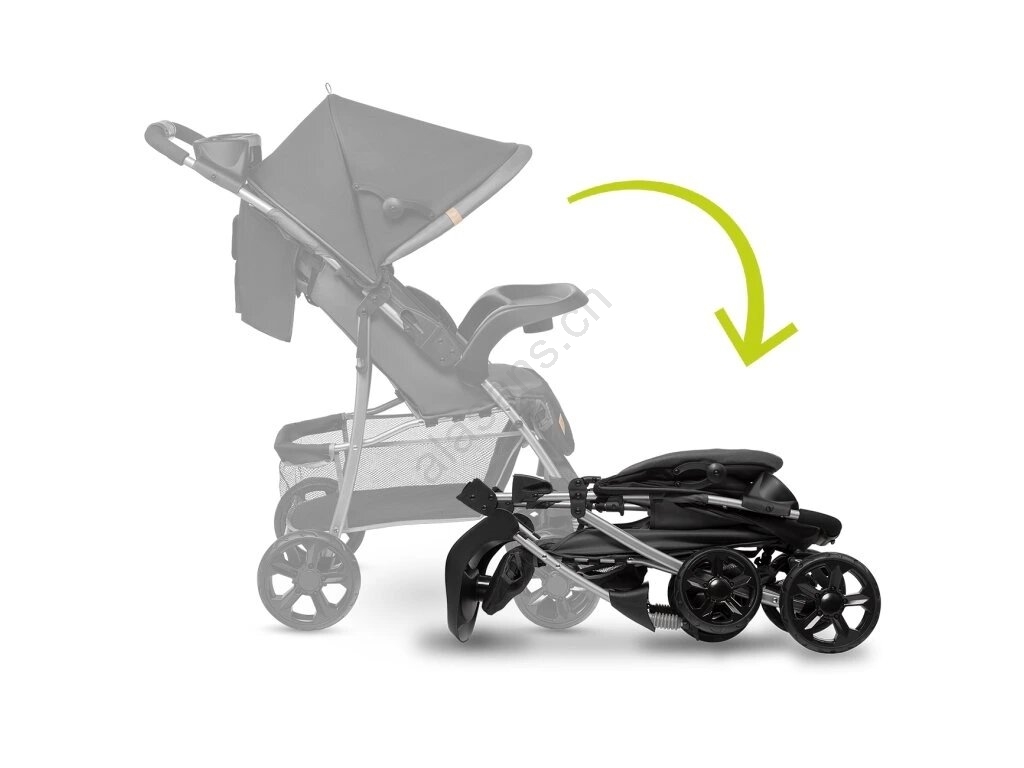 • Der Kinderwagen lässt sich mit einer Hand zusammenklappen.