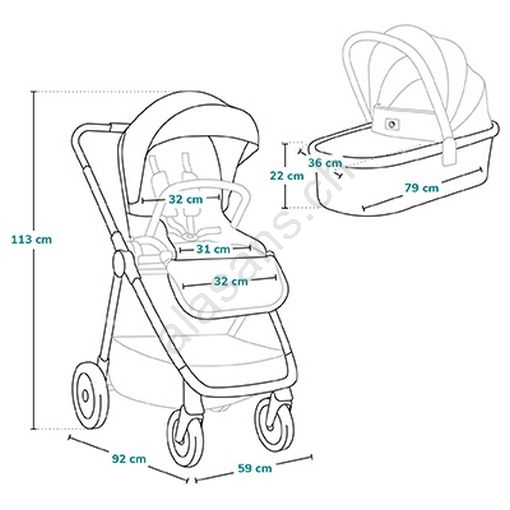 • Zubehörset: Fußsack, Moskitonetz, Bezug für den Babykorb, Regenverdeck, Elterntasche, Becherhalter, abschließbarer Korb.