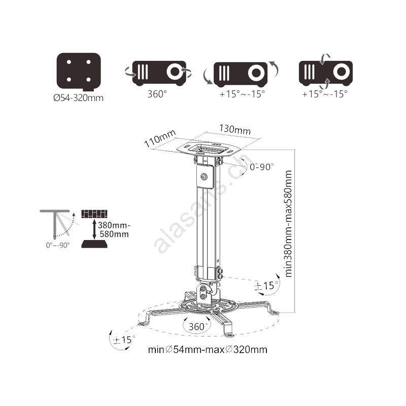 • Dank intelligenter Konstruktion und VESA-Kompatibilität (Lochabstand 54 - 320 mm) ist die Halterung für die überwiegende Mehrheit der Projektoren auf dem Markt geeignet.