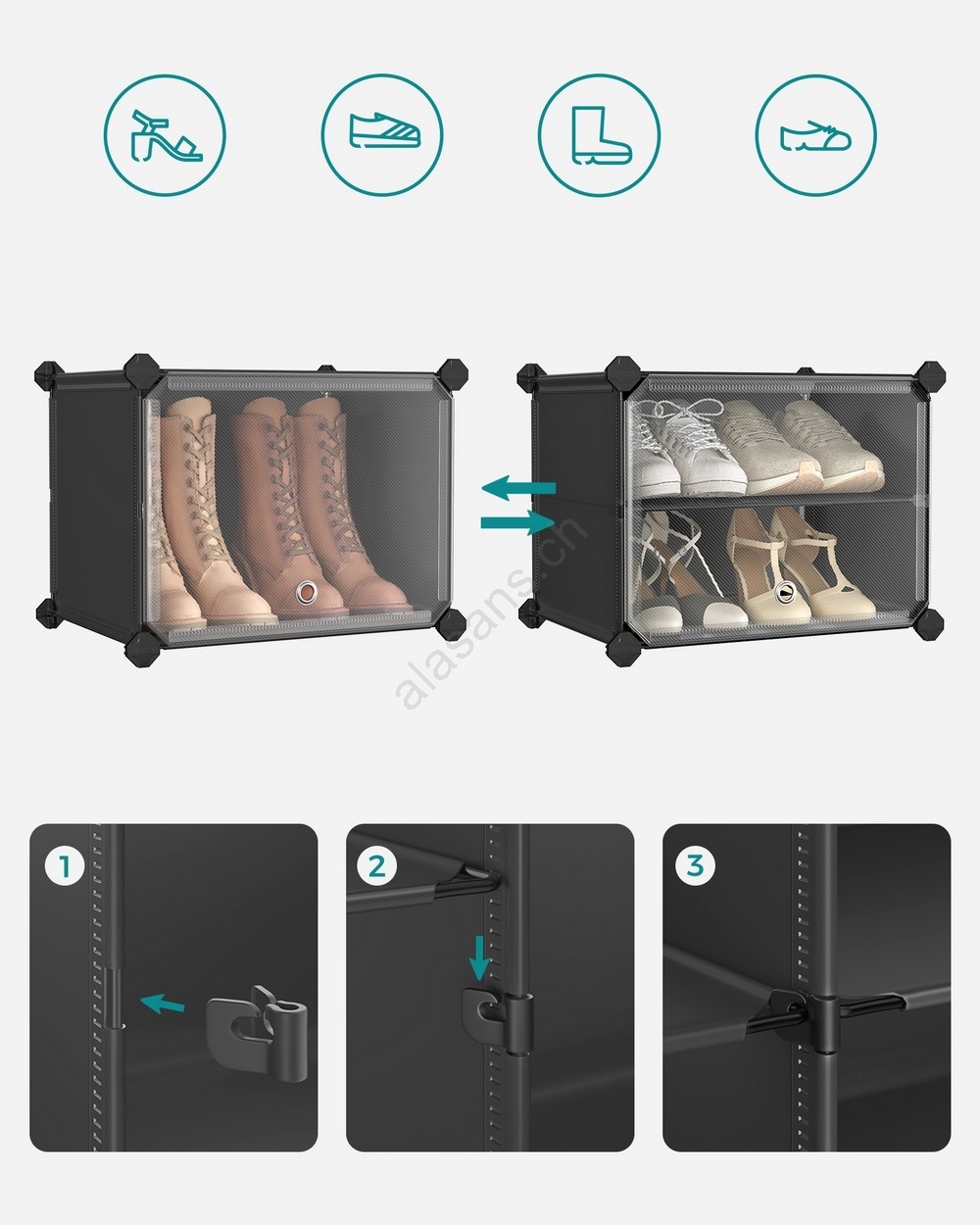 • Jeder Abschnitt dieses Schuhregals besteht aus hochwertigen Verbindungselementen, Kunststoffplatten und robustem Stahldraht und ist bis zu 5 kg belastbar.