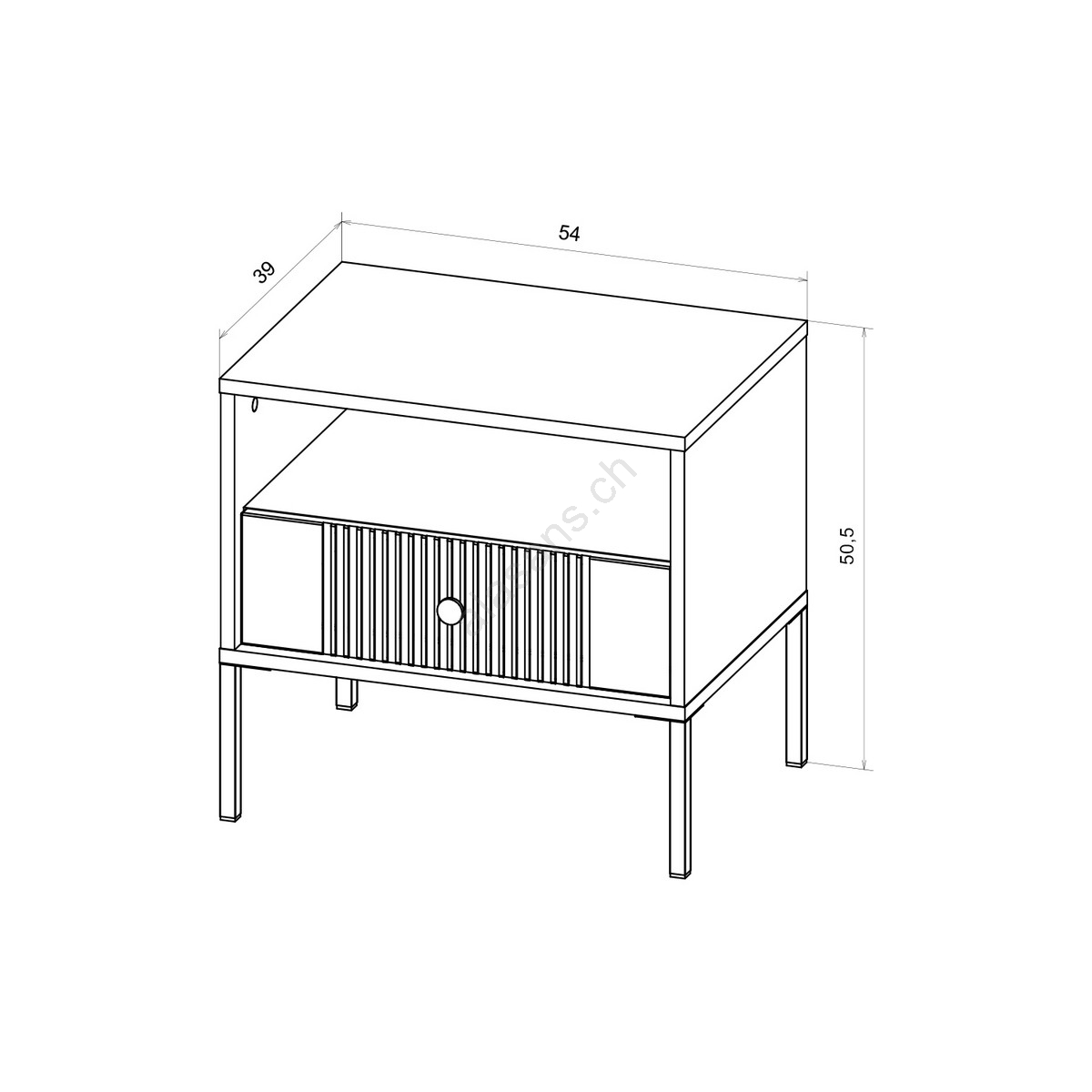 • Er verfügt über ein offenes Fach und eine Schublade mit vertikaler Riffelung für einen raffinierten visuellen Effekt.