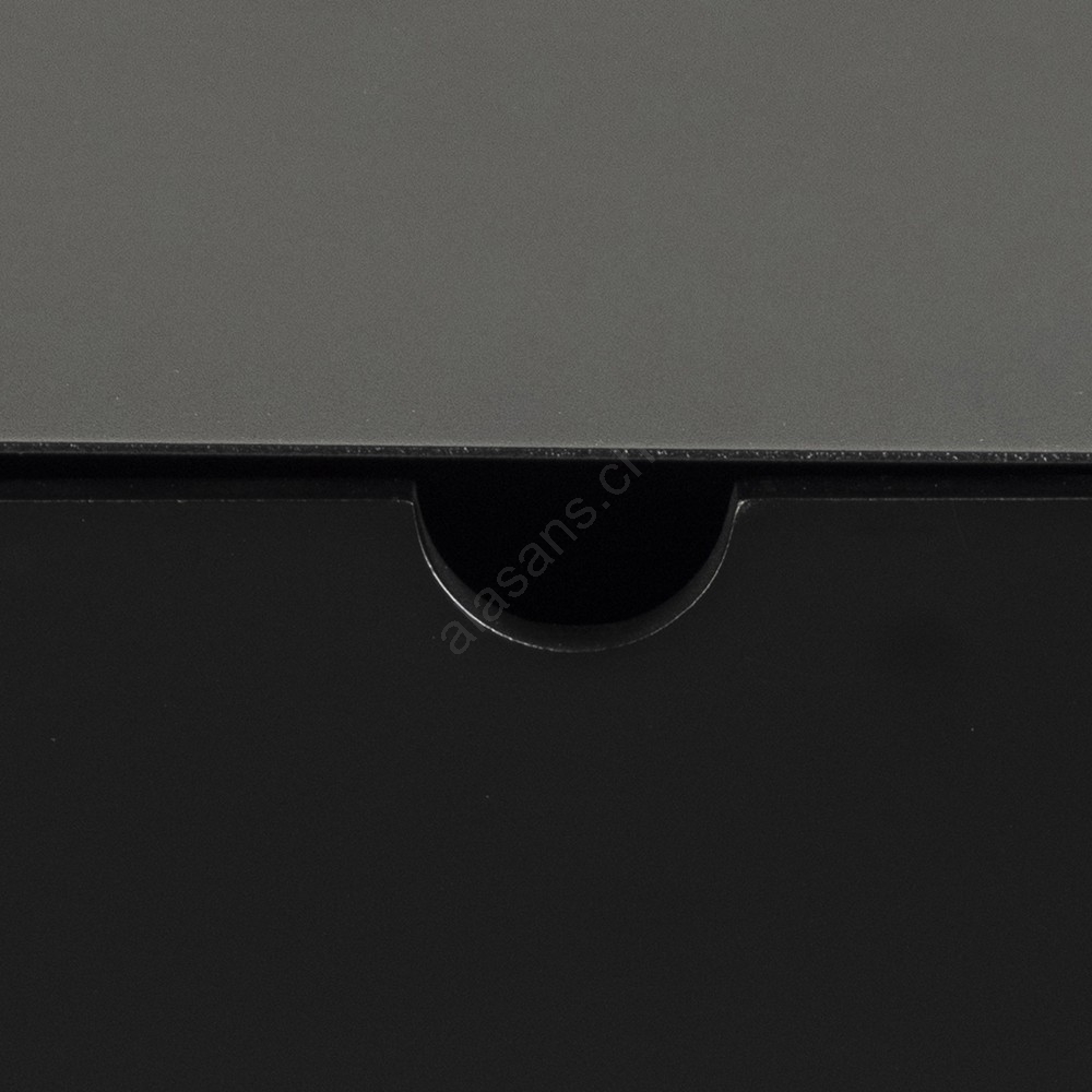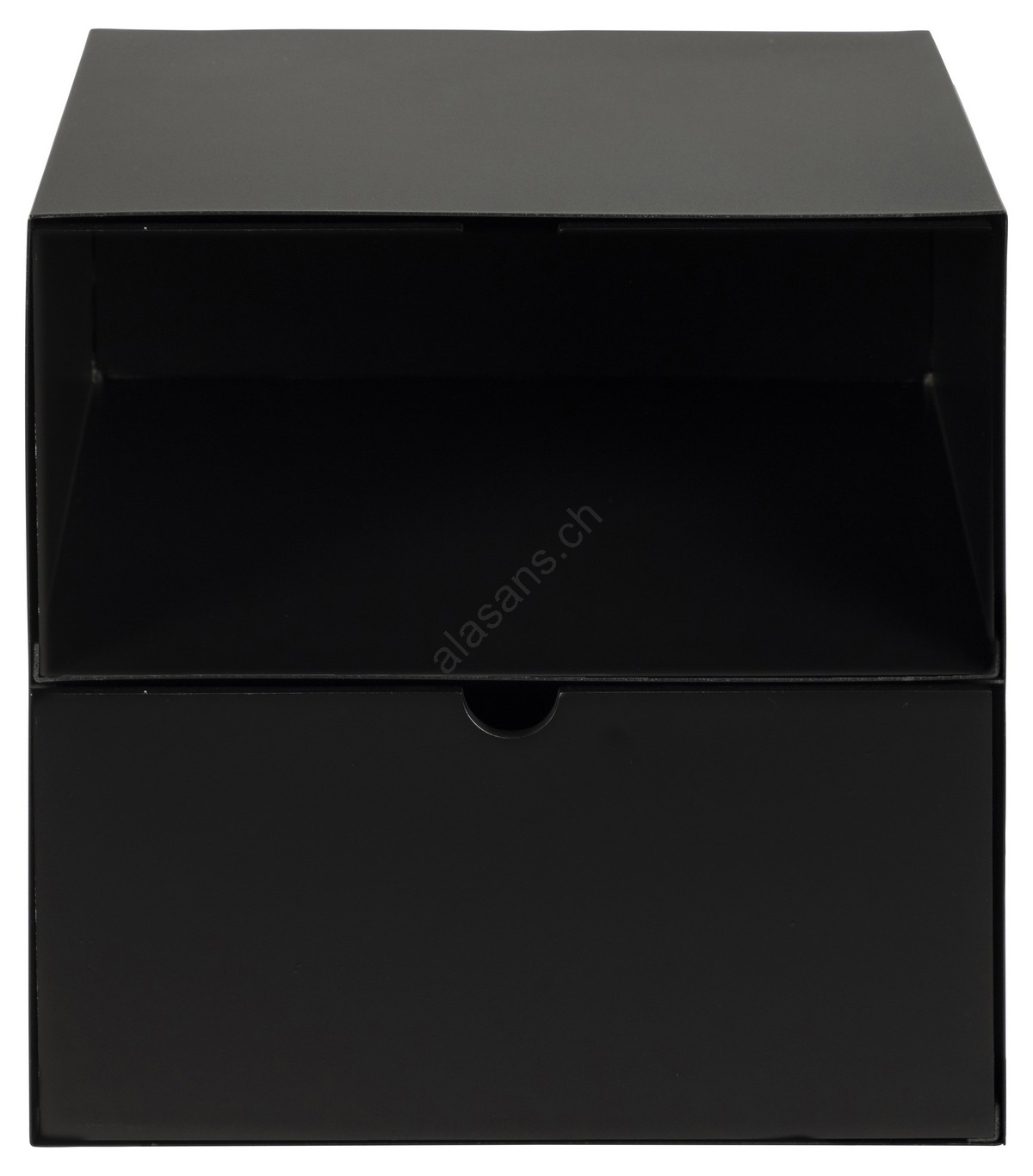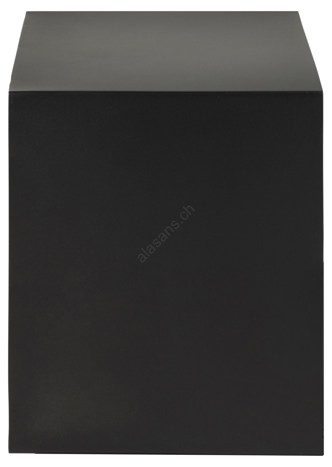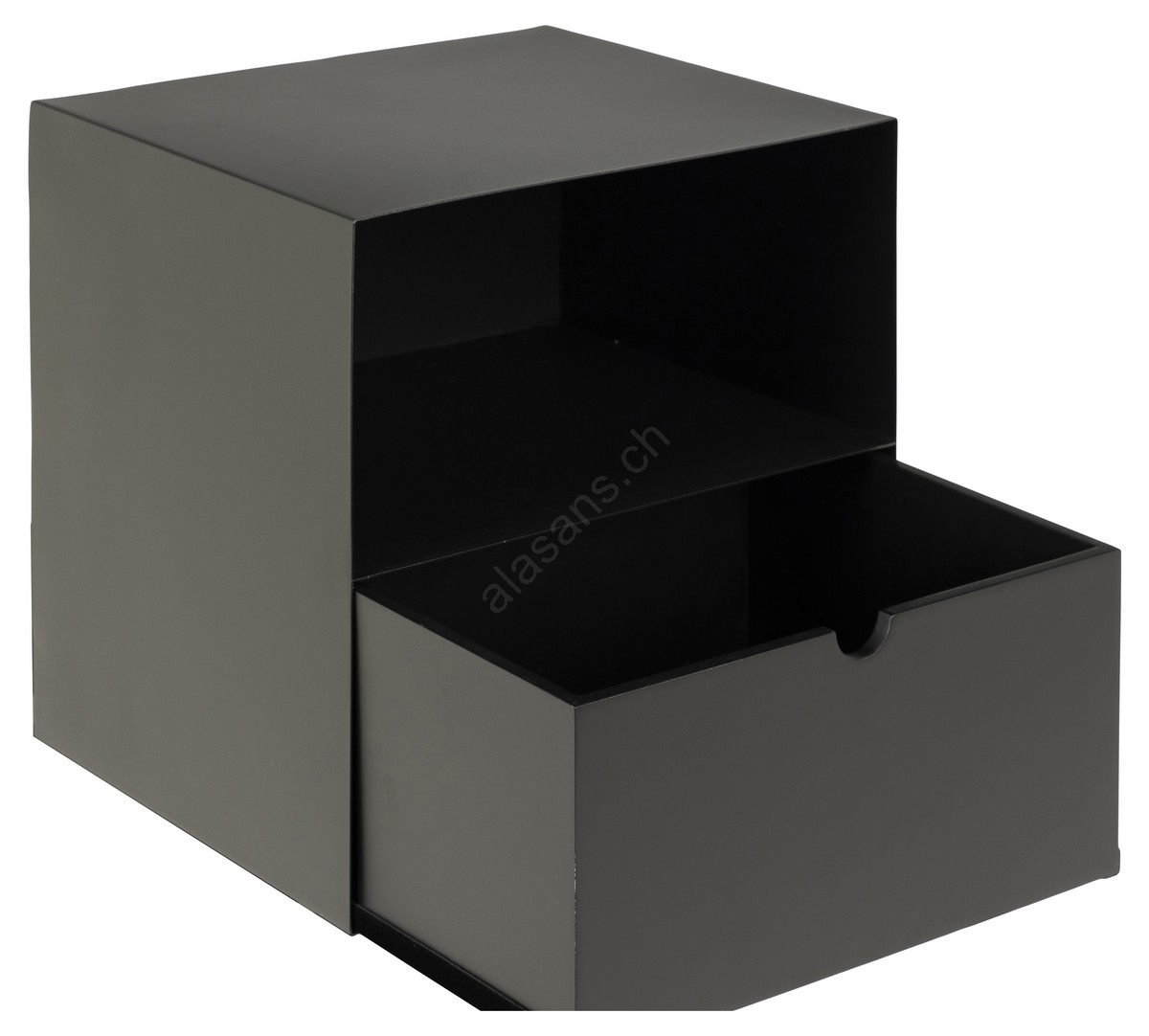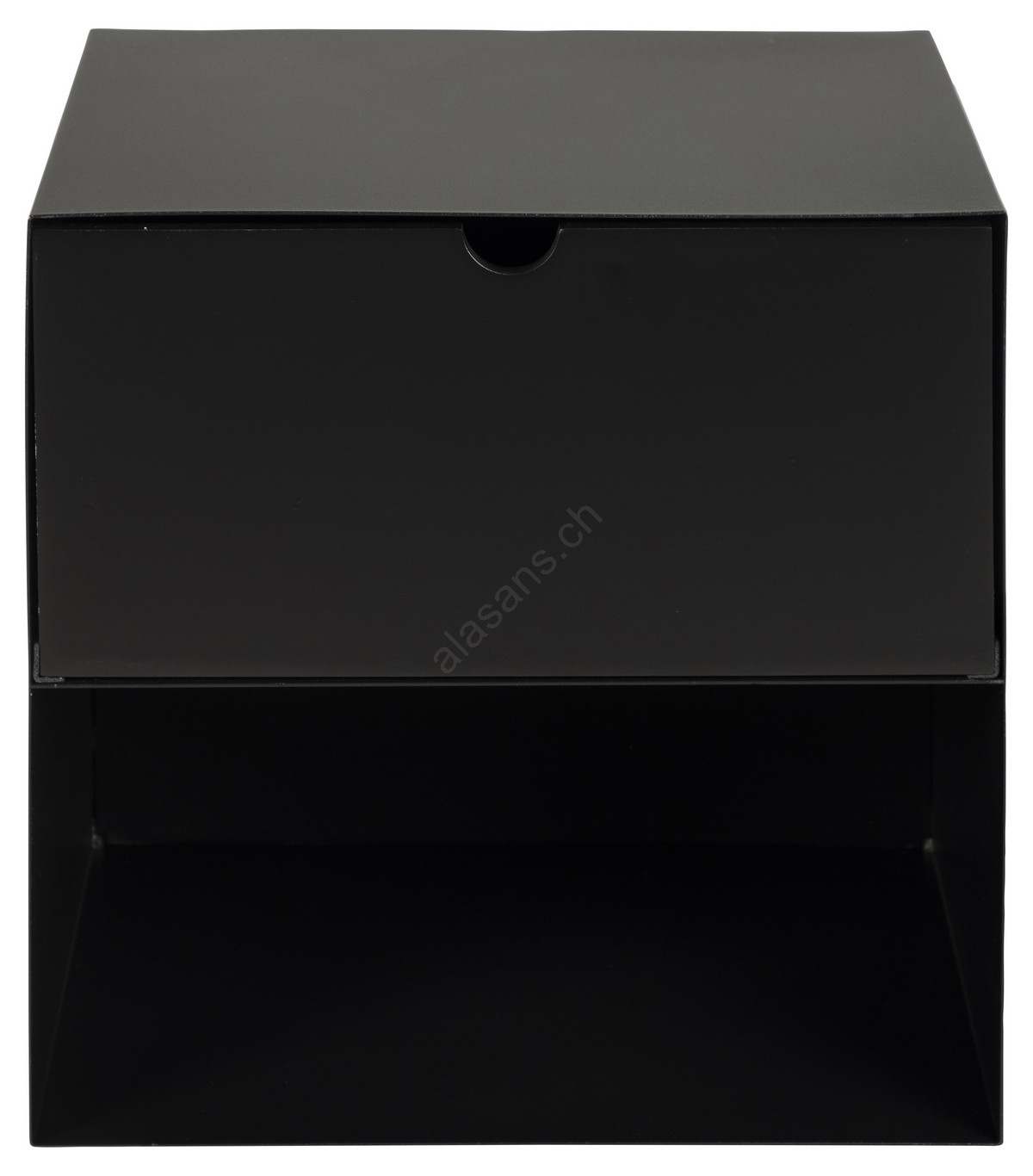 • Die Tischplatte und der Rahmen aus matt-schwarzem, grob pulverbeschichtetem Stahl, Schublade in Schwarz mit offenem Fach und für die Wandmontage.