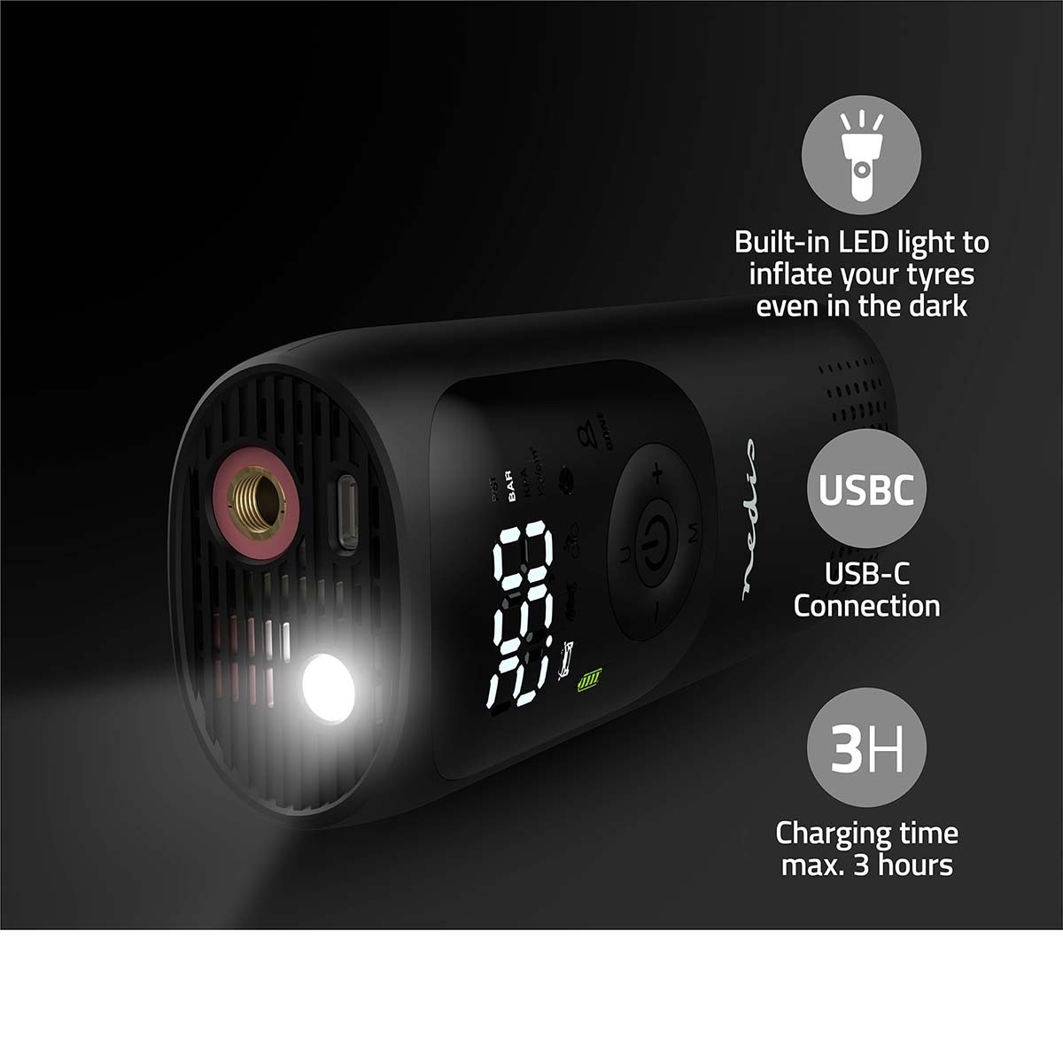 • Übersichtliches digitales LED-Display und integriertes LED-Licht für das Aufpumpen der Reifen auch bei Dunkelheit.