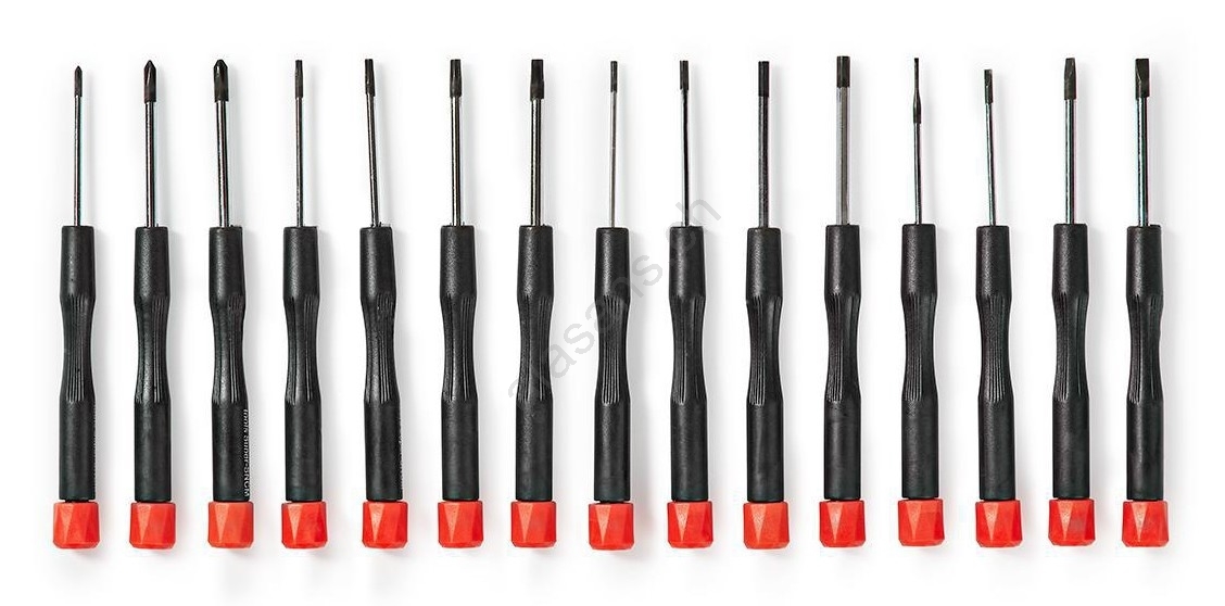 • Ein Satz von 15 Schraubendrehern in verschiedenen Größen für die gängigsten Schraubenköpfe.