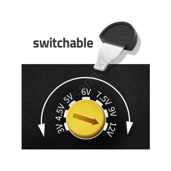 • Ein drehbarer Spannungswähler ermöglicht die einfache Einstellung des gewünschten Ausgangswerts im Bereich von 3 až 12 V DC, was die Kompatibilität mit verschiedenen Gerätetypen sicherstellt.