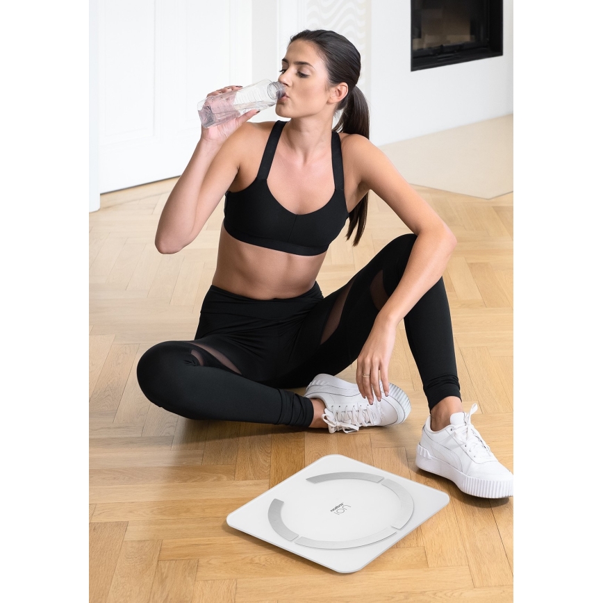 • Die Körperwerte werden mittels der fortschrittlichen Bioelektrischen Impedanzanalyse (BIA) gemessen, wodurch die Waage ein sehr detailliertes und präzises Bild der Körperzusammensetzung und des allgemeinen Gesundheitszustands liefert.