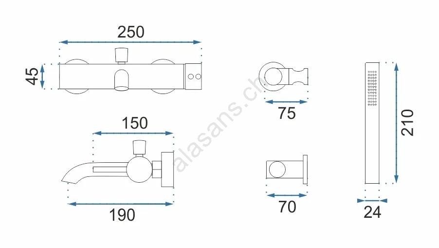 • Das Set enthält: Badewannenarmatur, Handbrause, Duschschlauch (190 mm), Handbrausehalter.
