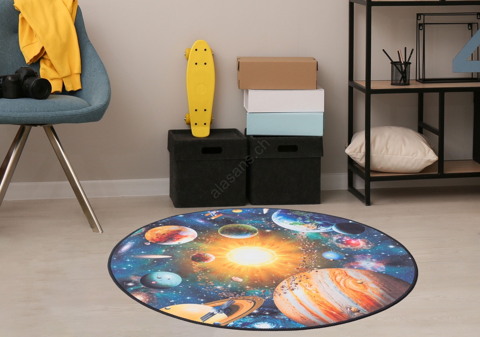 • Bunter Kinderteppich mit Planetenmotiv.