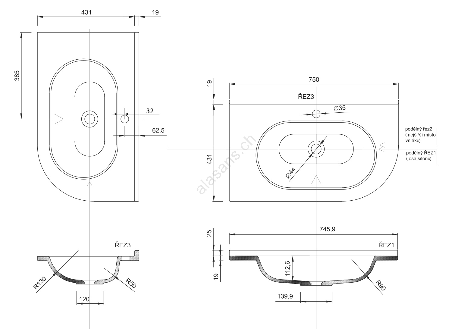 • Das Waschbecken ist ein Eckmodell aus Mineralguss.