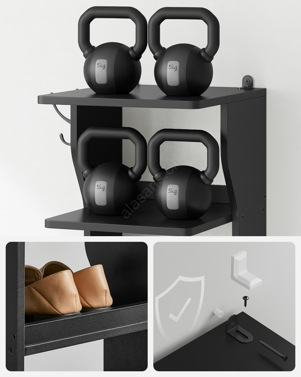 • Jede Ebene dieses Schuhschranks trägt bis zu 10 kg; ein Anti-Kipp-Set erhöht seine Stabilität.