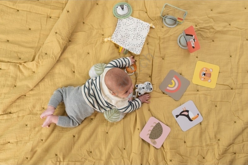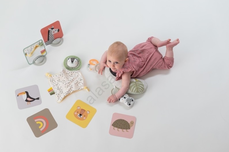 • Ein Set mit kontrastreichen Bildern und ein sicherer Spiegel mit zwei Halterungen sind ebenfalls so konzipiert, dass sie vor dem Baby in der Bauchlage platziert werden können.