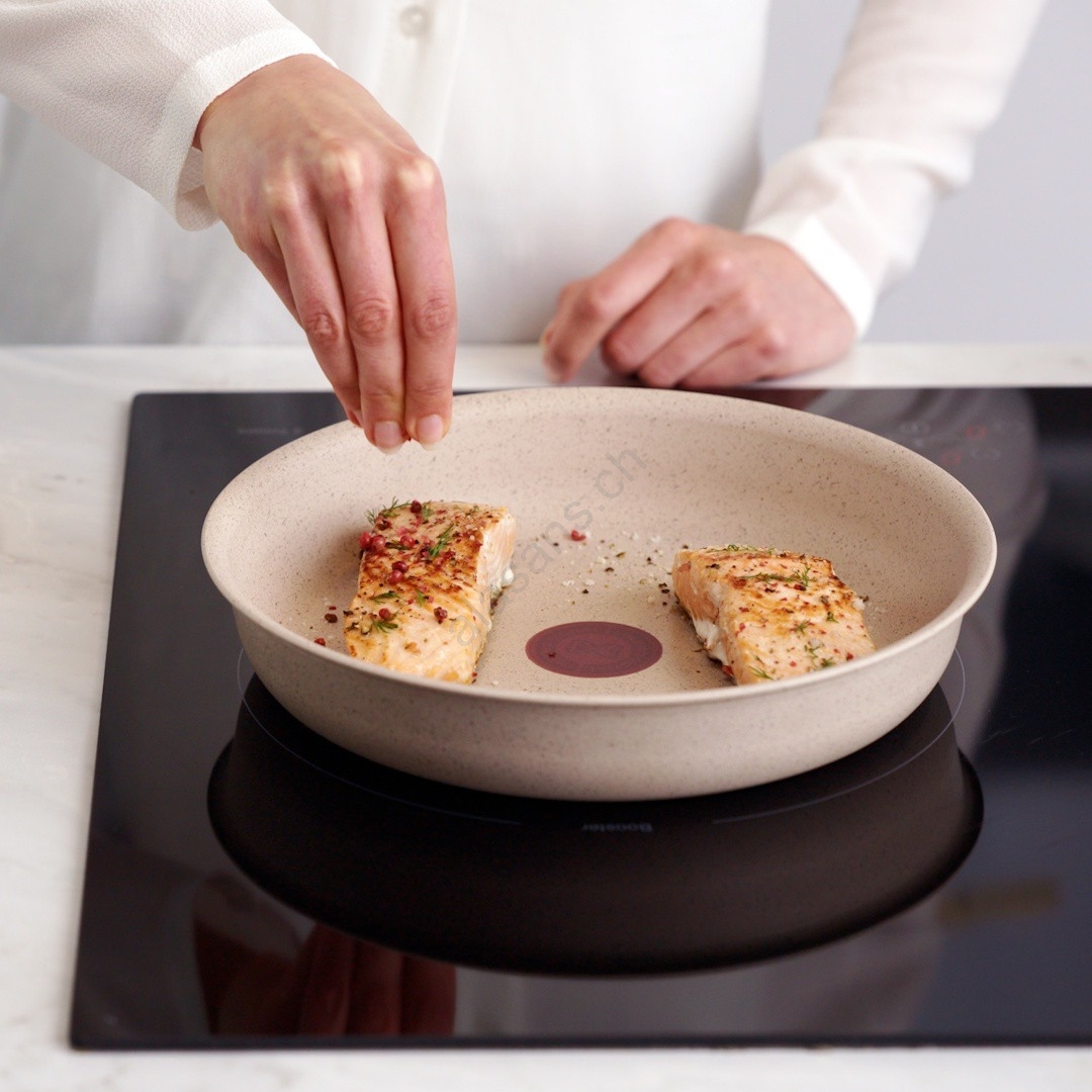 • Der Boden ist mit der Thermo-Fusion™-Technologie ausgestattet, die eine gleichmäßige Wärmeverteilung über die gesamte Pfannenfläche sicherstellt.