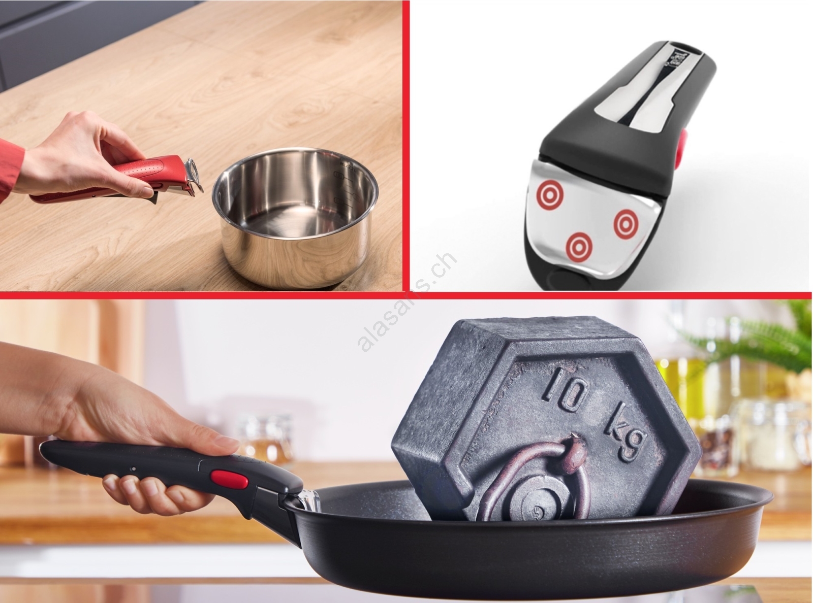 • Die Konstruktion ist mit einem abnehmbaren Griff ausgelegt, der platzsparende Aufbewahrung, die Verwendung im Ofen sowie das Servieren ohne Griff ermöglicht.