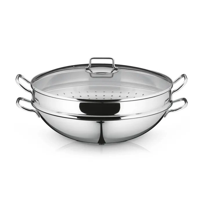 • Vollständiges 4‑teiliges Set: Das Set enthält eine Wokpfanne mit 36 cm Durchmesser, einen Glasdeckel, einen perforierten Dämpfeinsatz und ein rostfreies Abstellgitter zum Warmhalten der Speisen.