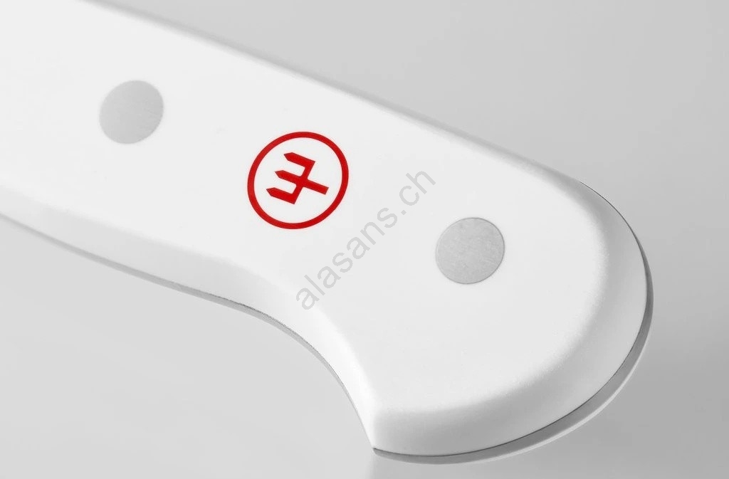 • Der Griff besteht aus POM (Kunststoff), ist weiß, farbbeständig und mit drei Nieten aus Edelstahl befestigt.